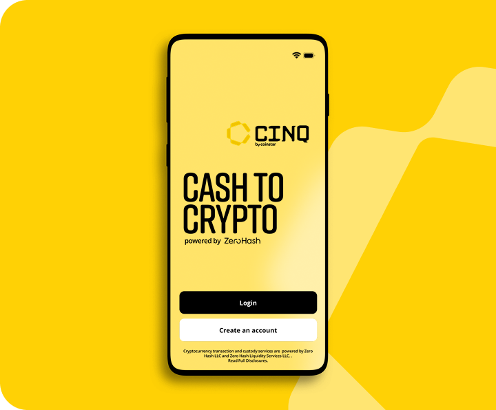With the CINQ by Coinstar crypto wallet powered by Zero Hash, you can transform your cash into 25+ crypto assets at Coinstar® kiosks and choose from 30+ crypto assets when you buy in the app.